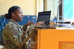 U.S. Air Force Staff Sgt. Jasmyn McClendon, cyber systems operator with the 236th Combat Communication Squadron, Louisiana National Guard, monitors the status of the deployed network in support of exercise Air Defender 2023 (AD23) at Hohn, Germany, June 13, 2023. (U.S. Air National Guard photo by Maj. Larissa Lambert)