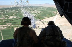 U.S. Army Sgt. 1st Class Len Tidey (left) and Sgt. 1st Class Tom Rees execute a leaflet drop over Helmand Province, Afghanistan, on April 1, 2006. (DoD photo by Spc. Leslie Angulo, U.S. Army. (Released))