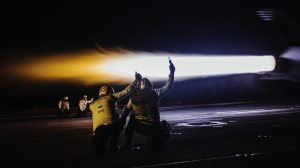 Sailors signal for an aircraft to launch off the flight deck of Nimitz-class aircraft carrier USS George Washington (CVN 73) while underway in the Philippine Sea, June 16, 2025. (U.S. Navy photo by Mass Communication Specialist 2nd Class August Clawson)