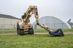 An L3Harris T7 Multi-Mission Robotics System inspects a suspicious bag during a peacetime improvised explosive device exercise at Dover Air Force Base, Delaware, May 14, 2025. (U.S. Air Force photo by Senior Airman Trenten Walters)