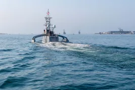 Seahawk, a Medium Unmanned Surface Vessel (MUSV) prototype, departs Naval Base Point Loma, California, Aug. 6, 2025. (U.S. Navy photo by Mass Communication Specialist 1st Class Robert Zahn)