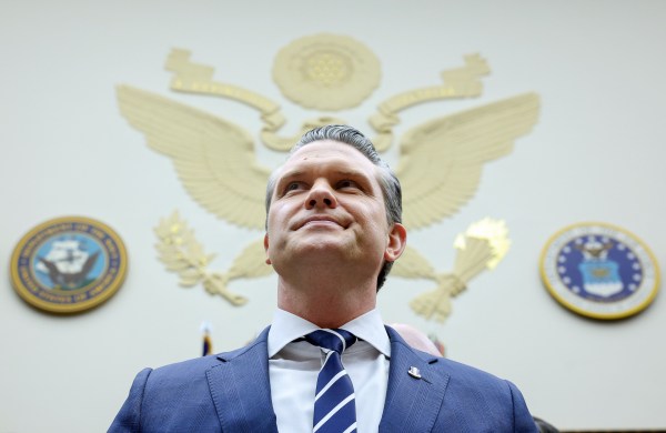 US Secretary of Defense Pete Hegseth (R) speaks alongside US CENTCOM Commander Admiral Brad Cooper (L) during a press briefing at the Pentagon in Washington, DC, on April 16, 2026. (Photo by SAUL LOEB / AFP via Getty Images)