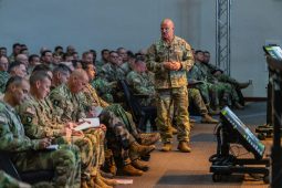 Gen. James J. Mingus, U.S. Army Vice Chief of Staff, delivers a presentation on The Evolving Character of War during the third day of the annual Maneuver Warfighter Conference, Sept. 11, 2025, in Marshall Auditorium at Fort Benning, Georgia. The annual Maneuver Warfighter Conference gathers U.S. Army senior leaders and subject-matter experts from across the globe to discuss the way forward for maneuver forces. (U.S. Army photo by Joey Rhodes II)