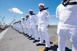 Sailors assigned to the amphibious assault ship USS America (LHA 6) participates in manning the rails as the ship prepares to arrive in Joint Base Pearl Harbor-Hickam, Hawaii, Sept. 8, 2025. (U.S. Navy photo by Mass Communication Specialist 2nd Class Amy Mullins)