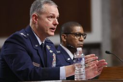 U.S. General Alexus G. Grynkewich, Supreme Allied Commander Europe (SACEUR) speaks alongside U.S. General Randall Reed, USAF, Commander of the United States Transportation Command (R), during a hearing with the Senate Armed Services committee at the Dirksen Senate Office Building on March 12, 2026 in Washington, DC. The hearing was held to examine the posture of United States European Command and United States Transportation Command. (Photo by Anna Moneymaker/Getty Images)